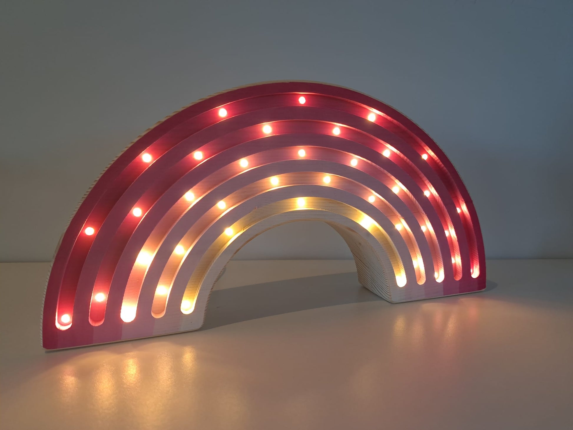 De speelse regenboogvorm en de warme gloed maken deze lamp perfect voor kinderkamers, woonkamers of als opvallend accent in je interieur. Elk exemplaar is met liefde en zorg met de hand gemaakt, waardoor je altijd een uniek stuk in huis haalt.